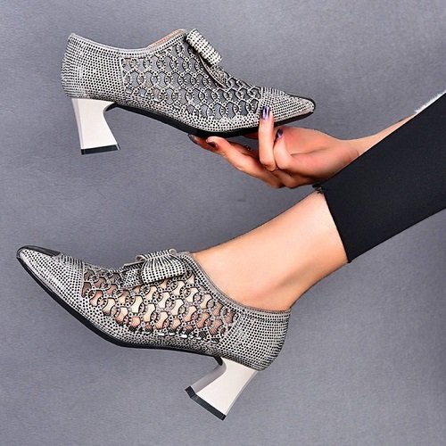 Rhinestone hollow chunky heel shoes